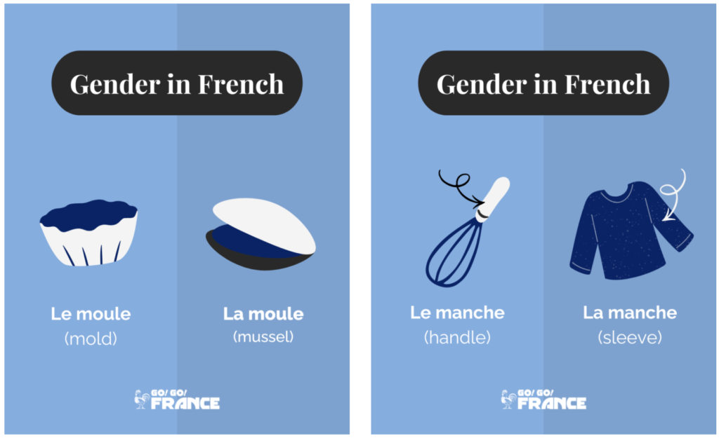 In French, every noun is either masculine or feminine. This affects not only the noun, but also the adjectives and articles that go with it. Sometimes, gender can even change a word’s meaning. For example, “le moule” (masculine) means mold, while “la moule” (feminine) means mussel.